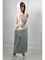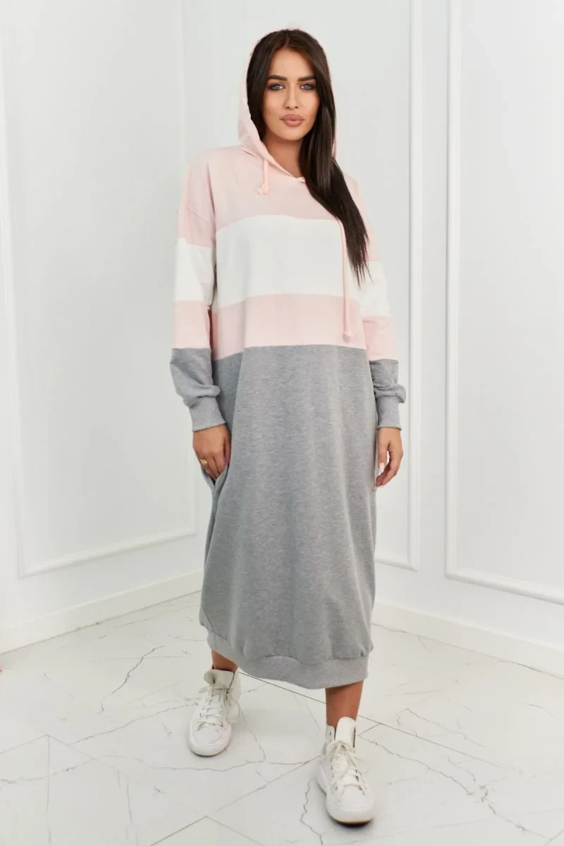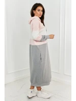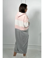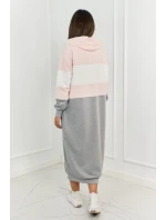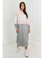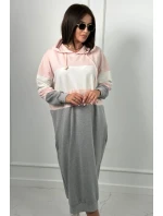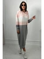 Trikolorní šaty s kapucí pudrově růžová + ecru + šedá