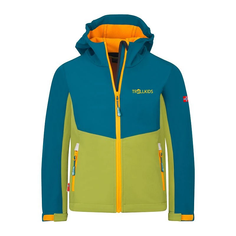 Trollkids Kristiansand Softshellová bunda hruškově zelená/laguna zelená/sluncová Sahara (320-360)