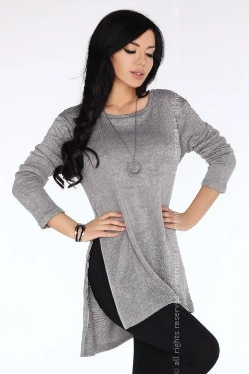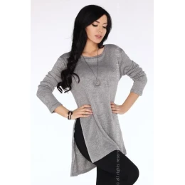 Tato zajímavá tunika je vyrobena z měkkého, pružného úpletu a lze ji použít jako halenku, tuniku nebo svetr. Má jemnou šedou barvu a jednoduchý střih, který zdobí dva posuvné zipy na obou stranách tuniky. Můžete je libovolně rozepínat a stále vytvářet nový vzhled. Složení: 85 % polyester, 15 % bavlna.