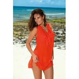 Výstřih se vzdušným volánkem je ženský a zajímavý, látka je pružná, lehce průhledná (typ "mesh tylu" - velmi oblíbený a nesmírně ženský), výstřih na zádech a spodní část tuniky je zakončena půlkruhem. 80 % polyamid, 20 % elastan.