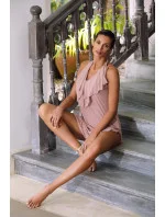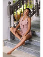 Výstřih se vzdušným volánkem je ženský a zajímavý, látka je pružná, lehce průhledná (typ "mesh tylu" - velmi oblíbený a nesmírně ženský), výstřih na zádech a spodní část tuniky je zakončena půlkruhem. 80 % polyamid, 20 % elastan.