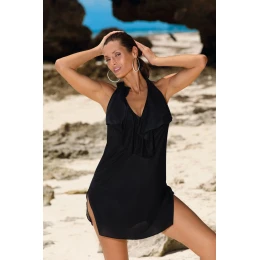 Výstřih se vzdušným volánkem je ženský a zajímavý, látka je pružná, lehce průhledná (typ "mesh tylu" - velmi oblíbený a nesmírně ženský), výstřih na zádech a spodní část tuniky je zakončena půlkruhem. 80 % polyamid, 20 % elastan.