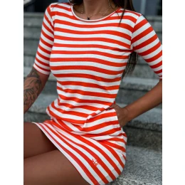 Bílé a oranžové šaty na každodenní nošení s kapsami od MAYFLIES.