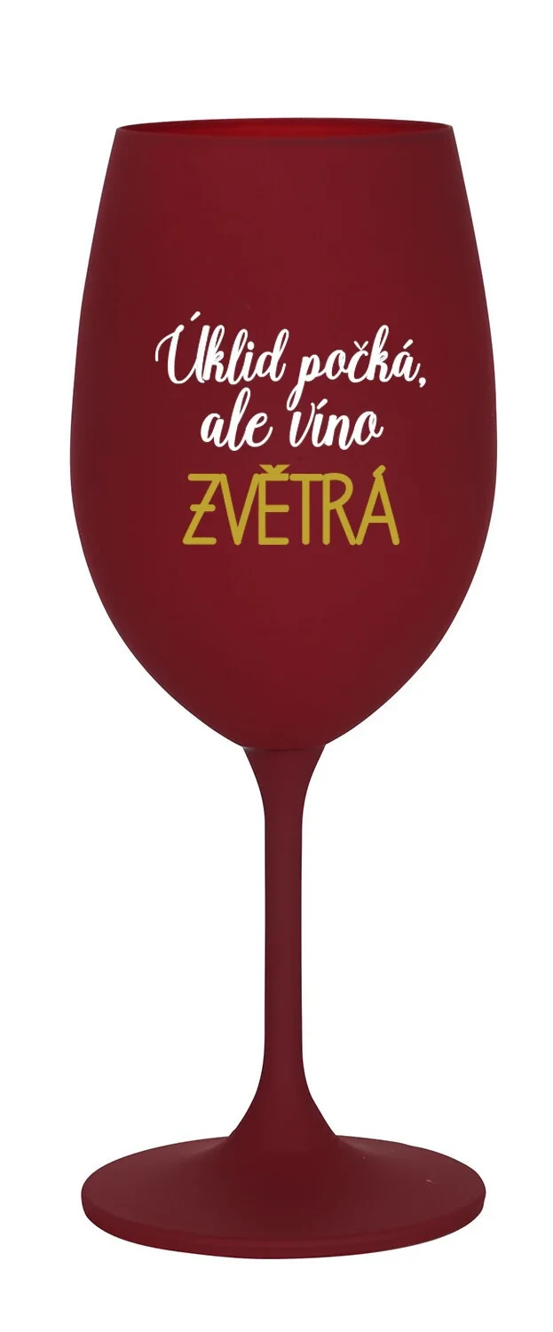 Vinná bordó sklenice s originálním motivem ÚKLID POČKÁ, ALE VÍNO ZVĚTRÁ je krásným a osobitým dárkem, které ale využijete i Vy sami třeba ve chvílích, kdy si budete chtít zpříjemnit náročný den. Tyto originální vinné sklenice jsou totiž nejen pro výjimečné události, ale i pro běžné večery, které si chcete zpříjemnit sklenkou dobrého vína. Jistě proto potěší každého milovníka vína, i toho, kdo si umí svůj život vychutnat plnými doušky.