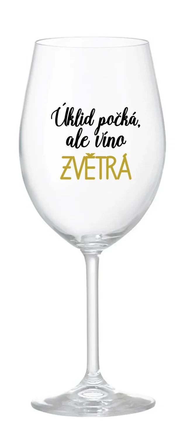 Vinná čirá sklenice s originálním motivem ÚKLID POČKÁ, ALE VÍNO ZVĚTRÁ je krásným a osobitým dárkem, které ale využijete i Vy sami třeba ve chvílích, kdy si budete chtít zpříjemnit náročný den. Tyto originální vinné sklenice jsou totiž nejen pro výjimečné události, ale i pro běžné večery, které si chcete zpříjemnit sklenkou dobrého vína. Jistě proto potěší každého milovníka vína, i toho, kdo si umí svůj život vychutnat plnými doušky.