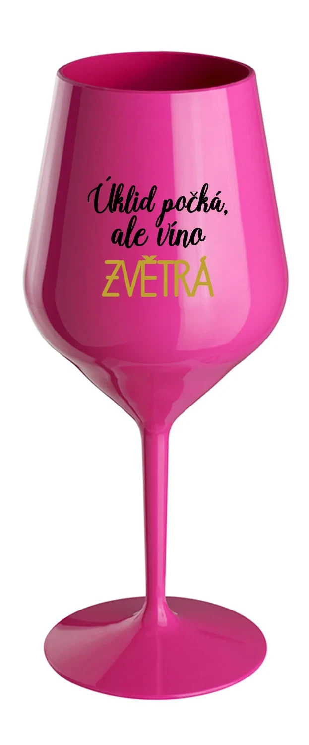 Nerozbitná růžová vinná sklenice s motivem ÚKLID POČKÁ, ALE VÍNO ZVĚTRÁ je skvělá na zahradu, pláž, výlet, piknik a parádu udělá i při kempování. Jelikož je vyrobená z kvalitního polykarbonátu je de facto nerozbitná. Je to luxusní kousek, s nímž si víno můžete vychutnat prostě kdekoliv. Mají ergonomický tvar, který příjemně padne do ruky a protože je lehká, usnadňuje to její přenášení. Je snadno skladovatelná a lehce se čistí. Díky svému designu si s ní můžete vychutnat doopravdy kdekoliv bezproblémové pití výborného vína.