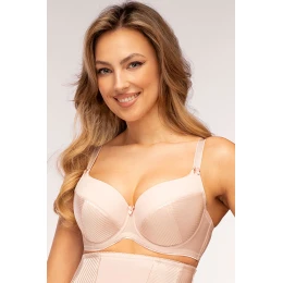 Podprsenka Unikat, model Fiona, s drátky, které podporují a tvarují prsa. svislé kostice na bocích. nastavitelná ramínka, neodnímatelná. kovové háčky na ramínkách. zapínání na háčky. místo zapínání: na zádech. tři řady svislých háčků. dvě řady vodorovných háčků. 83 % polyamid, 12 % elastan, 5 % bavlna. dámské oblečení.