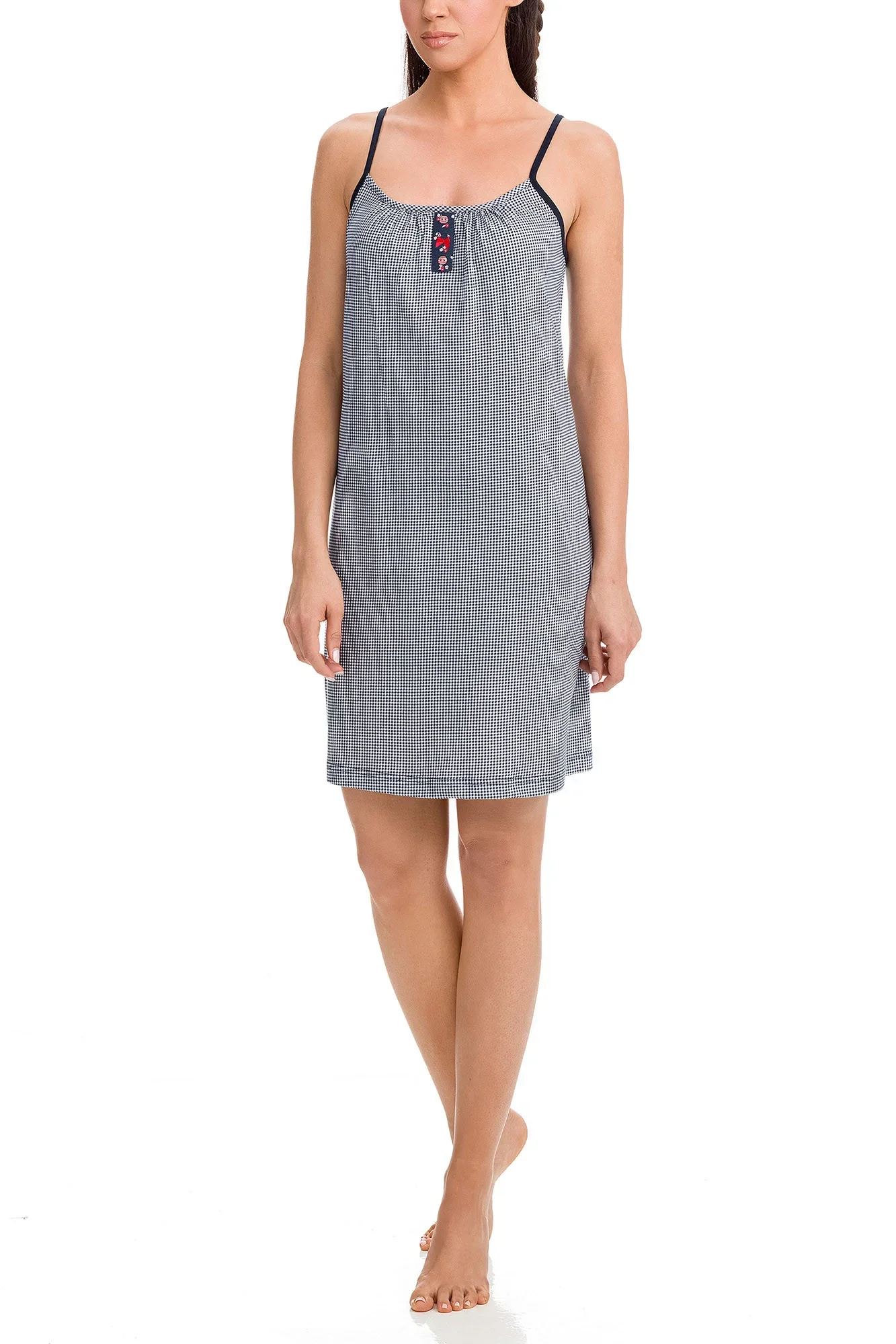 Dámská noční košilka na špagetových ramínkách a vzorem jemných kostiček s ozdobným detailem barevných knoflíků a mašličky. Čistá bavlna zajistí Váš klidný spánek.