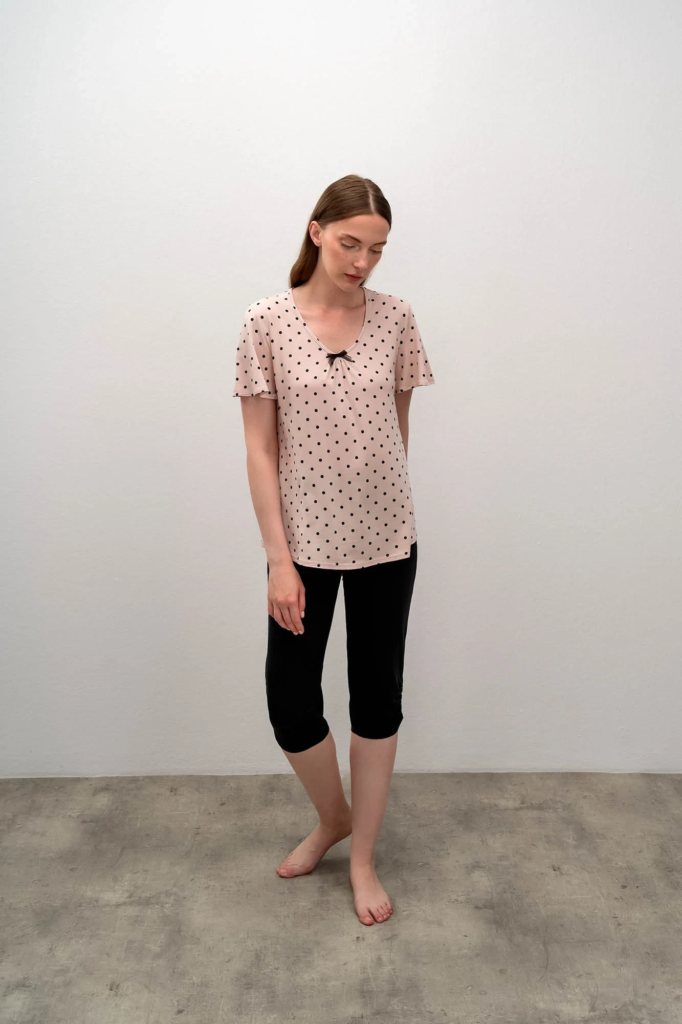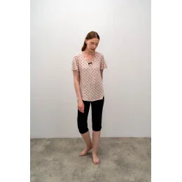 Dámské pyžamo s motivem puntíků pro pocit vyjímečnosti a pohodlné spaní. Set tvoří košilka s krátkým rukávem a kulatým výstřihem s mašličkou spolu s jednobarevnými kalhoty ve 3/4 délce. Dvoudílné pyžamo je vyrobeno z vysoce kvalitního Micro-modalu s příměsí Elastanu. Přírodní Micro-modal poskytuje vyjímečnou měkkost a pohodlí, je prodyšný, při praní se nesráží, dobře absorbuje pot a rychle schne, zatímco Elastan dodává oděvu potřebnou pružnost.