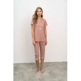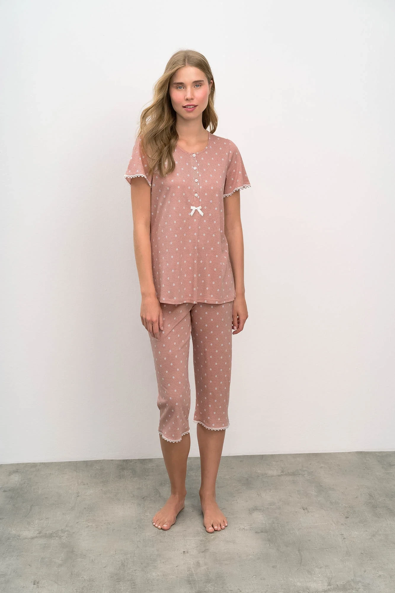 Dvoudílné dámské pyžamo pro pohodlné spaní i pro romantické chvíle. Komplet sestává z košilky s jemným potiskem puntíku a decentní krajkou kolem rukávu, který doplňují kalhoty ve 3/4 délce. Dámské pyžamo je vyrobené z kvalitní přírodní řecké bavlny s příměsí modalu. Oba typy tkanin poskytkují vysoké pohodlí, příjemný pocit na dotek, prodyšnost a odolnost, modal pak i zvýšenou lehkost a pružnost.