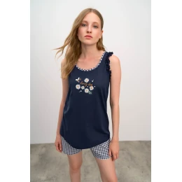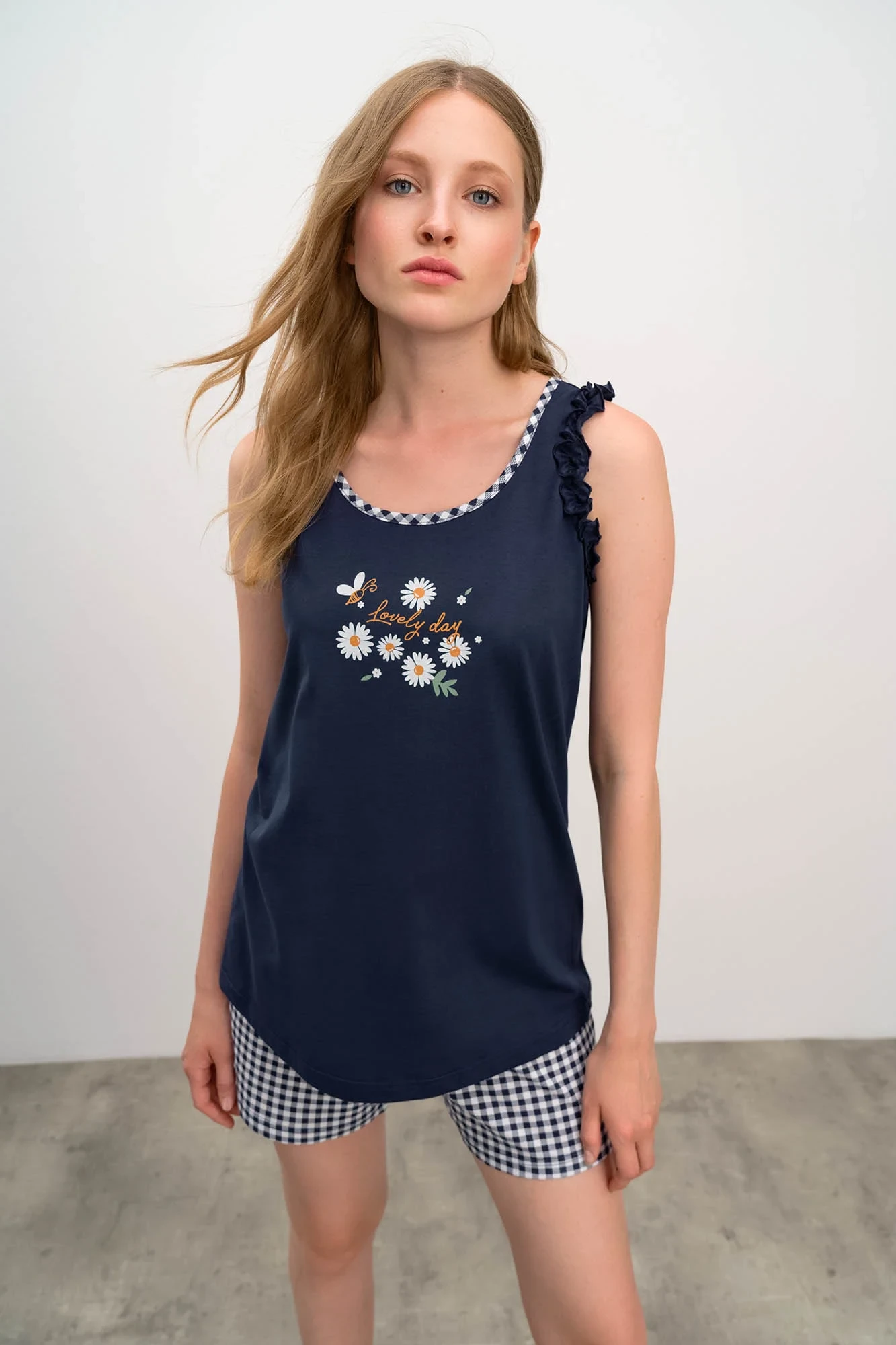 Dvoudílné dámské pyžamo pro pohodlný spánek. Komplet sestává z košilky na ramínka s květinovým potiskem, který dopňují krátké kostkované šortky s pohodlnou gumou v pase. Pyžamo je vyrobené z vysoce kvalitní, genetický nemodifikované řecké bavlny, která poskytuje vysoké pohodlí, příjemný pocit na dotek, prodyšnost, pružnost a odolnost.