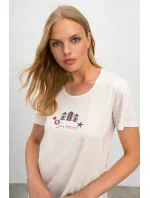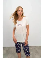 Dvoudílné dámské pyžamo pro pohodlný spánek. Komplet sestává z jednobarevné košilky s potiskem a krátkým rukávem, který dopňují 3/4 kalhoty potiskem domečků s pohodlnou gumou v pase. Pyžamo je vyrobené z vysoce kvalitní, genetický nemodifikované řecké bavlny, která poskytuje vysoké pohodlí, příjemný pocit na dotek, prodyšnost, pružnost a odolnost.