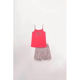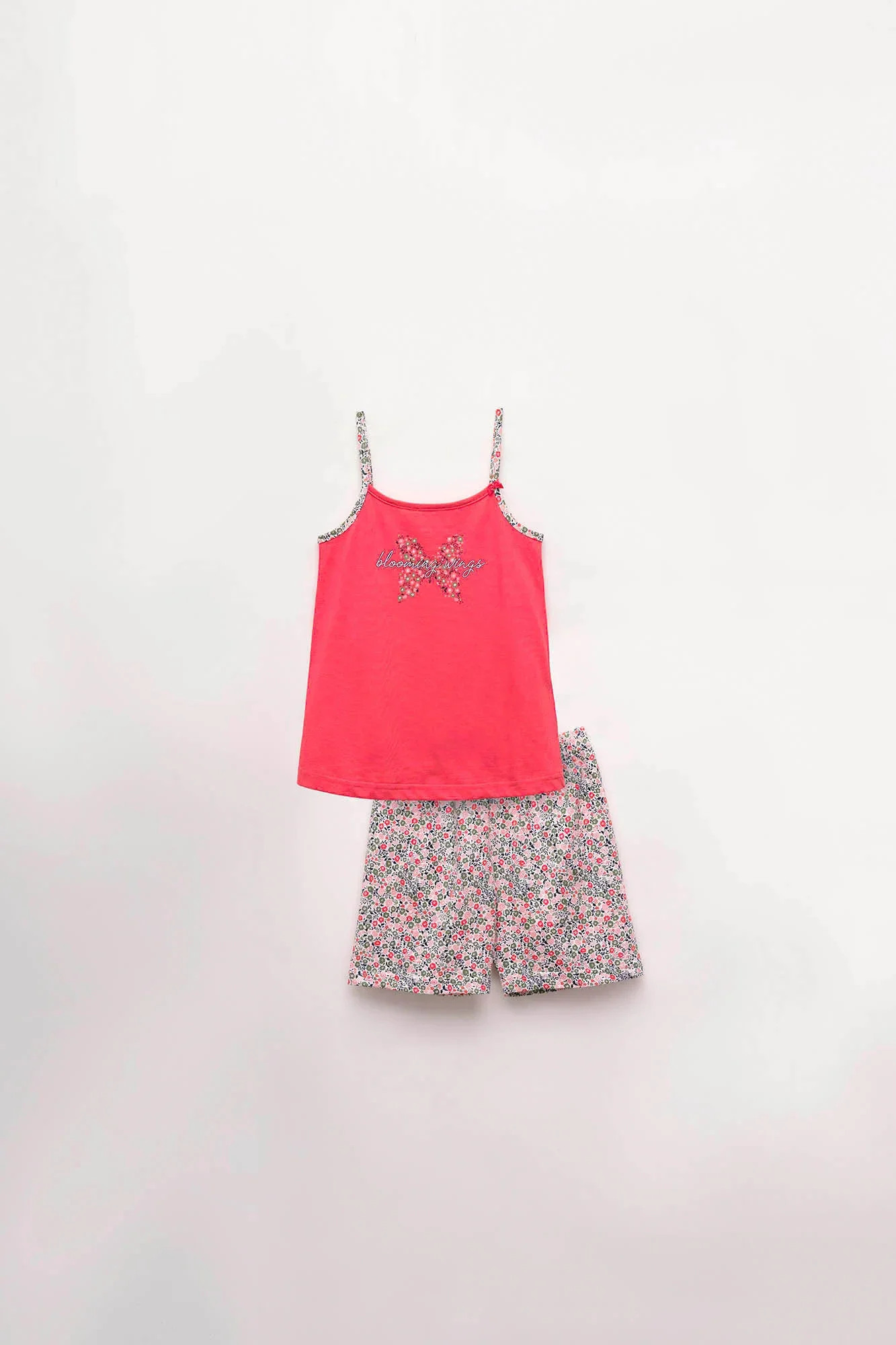 Dvoudílné dětské pyžamo pro pohodlný spánek. Komplet sestává z jednobarevné košilky na ramínka s potiskem, který dopňují krátké květované šortky s pohodlnou gumou v pase. Pyžamo je vyrobené z vysoce kvalitní, genetický nemodifikované řecké bavlny, která poskytuje vysoké pohodlí, příjemný pocit na dotek, prodyšnost, pružnost a odolnost.