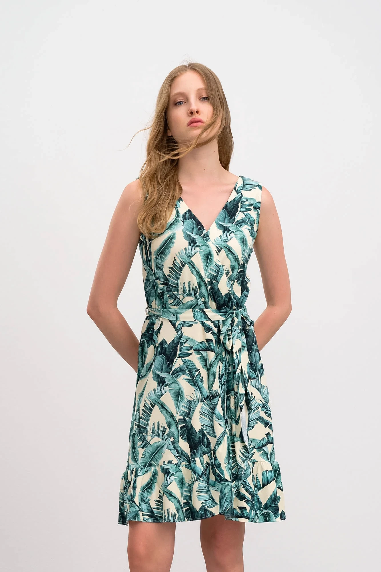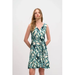 Elegantní dámské šaty s motivem listů a s výstřihem do V doplněné o pásek na zavazování, vše co žena v parných letních dnech potřebuje. Šaty jsou vyrobené z kvalitní jersey viskózy s příměsí elastanu. Jersey Viscoza se vyznačuje vysokou savostí, je dobře prodyšná, měkká a příjemná na dotek a elastan zaručuje lepší pružnost tkaniny.