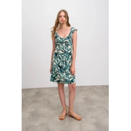Elegantní dámské šaty s motivem listů s kulatým zřaseným volánovým výstřihem, vše co žena v parných letních dnech potřebuje. Šaty jsou vyrobené z kvalitní jersey viskózy s příměsí elastanu. Jersey Viscoza se vyznačuje vysokou savostí, je dobře prodyšná, měkká a příjemná na dotek a elastan zaručuje lepší pružnost tkaniny.