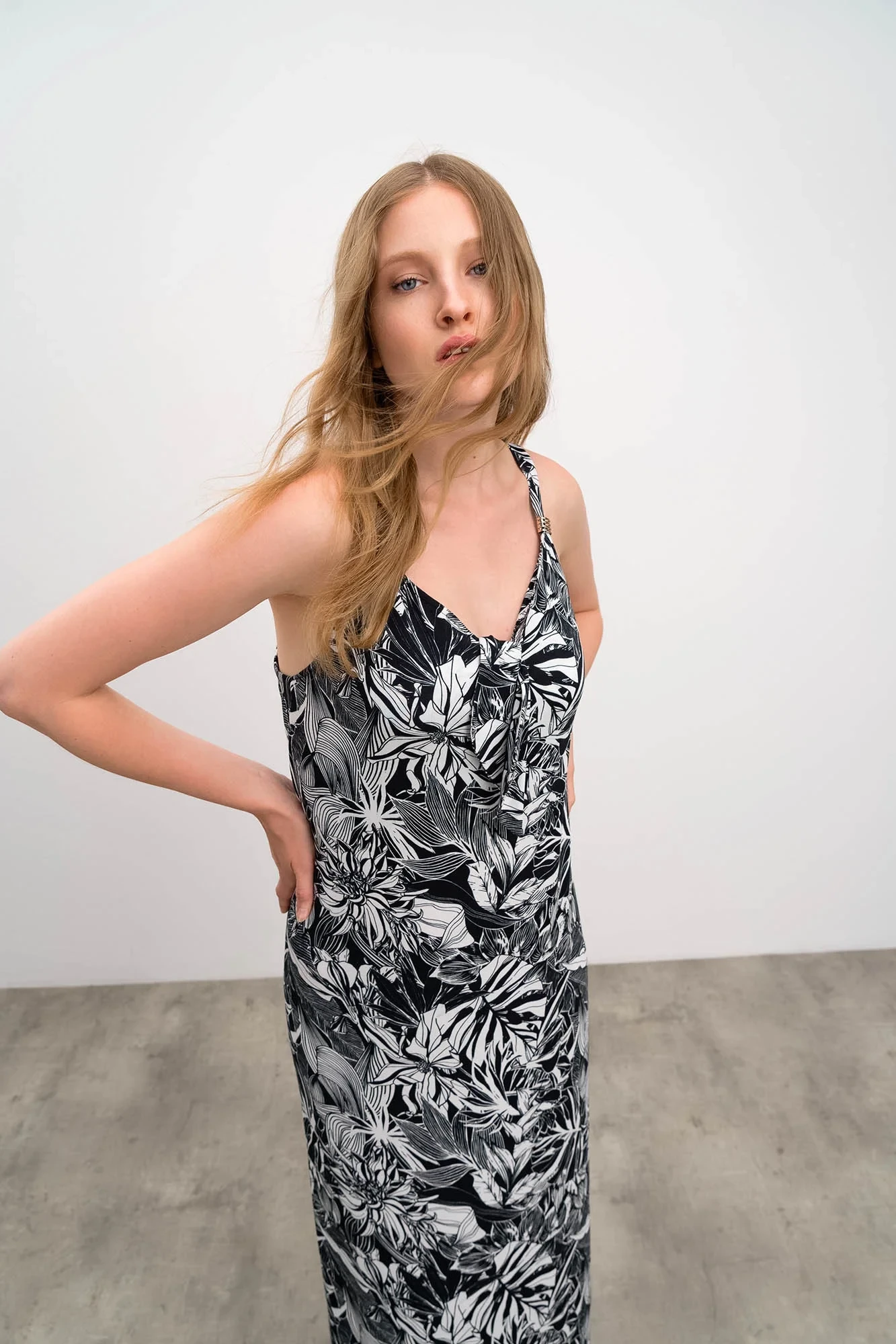 Elegantní dlouhé dámské šaty s květinovým motivem na ramínka s výstřihem do V, vše co žena v parných letních dnech potřebuje. Šaty jsou vyrobené z kvalitní jersey viskózy s příměsí elastanu. Jersey Viscoza se vyznačuje vysokou savostí, je dobře prodyšná, měkká a příjemná na dotek a elastan zaručuje lepší pružnost tkaniny.
