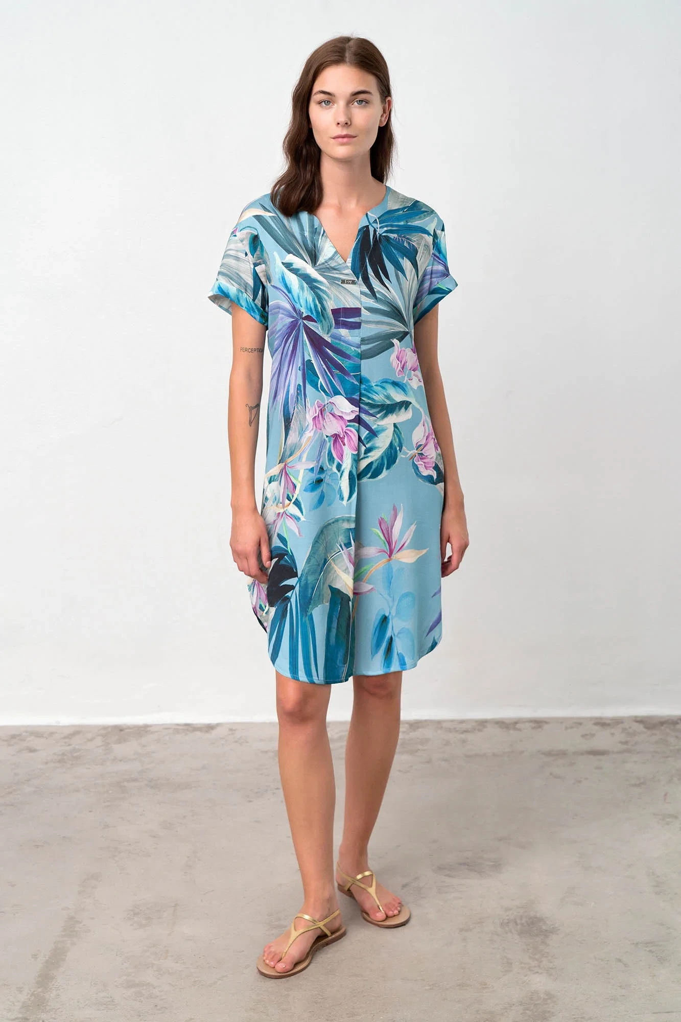 - délka a střih: 90 cm, krátký rukáv, výstřih do V