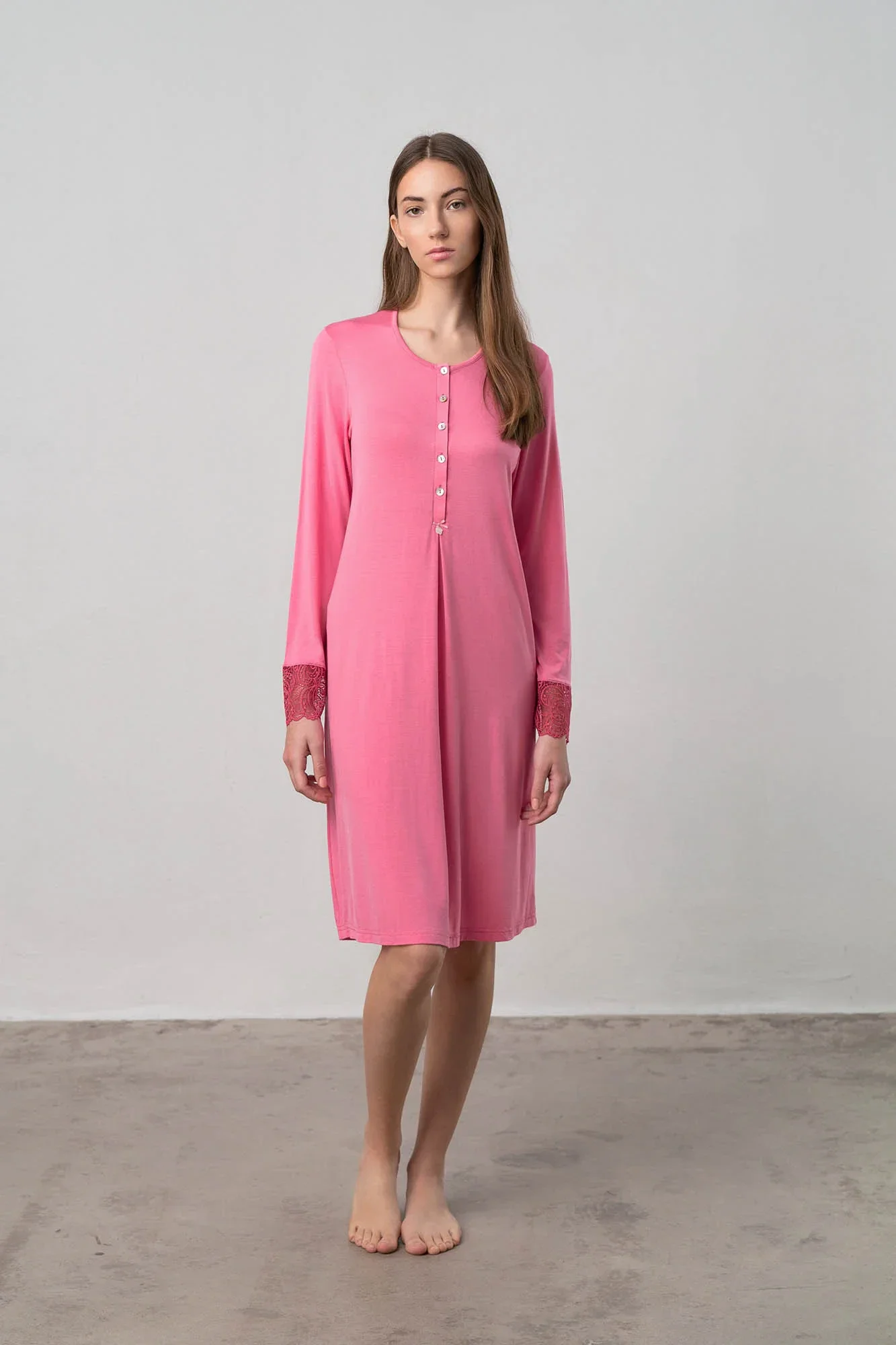 - střih: 100 cm, dlouhý rukáv s ozdobným zakončením, kulatý výstřih, knoflíková léga
