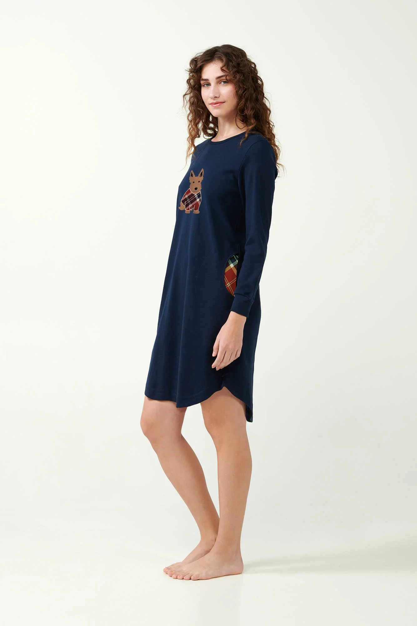 Objevte pohodlí a styl s naší rozkošnou noční košilí. Tato noční košile s roztomilým potiskem skotského teriéra na hrudi dodá vašemu spánku hravý nádech. Kapsy jsou potaženy klasickým tartanovým vzorem, který vytváří dokonalou kombinaci šarmu a rafinovanosti. Je vyrobena z měkké, 100% bavlněné interlokové tkaniny a zajistí klidný spánek. Pravidelný střih nabízí pohodlnou a lichotivou siluetu.