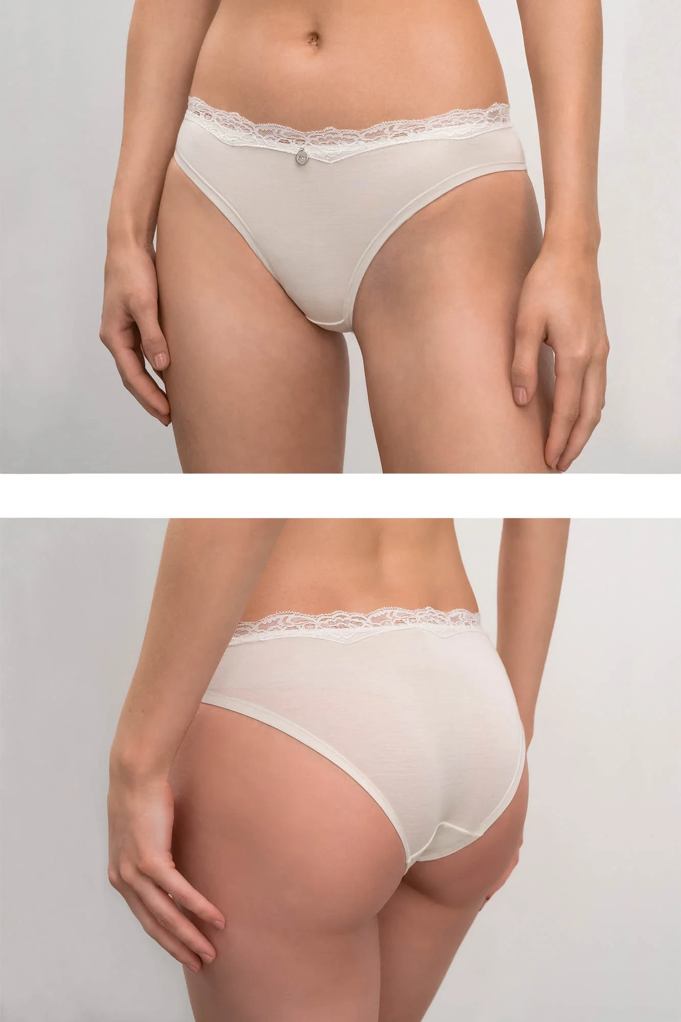 Pohodlné jednobarevné dámské kalhotky s krajkou, které jsou vyrobené z vysoce kvalitního Micro-modalu s příměsí Elastanu. Přírodní Micro-modal poskytuje vyjímečnou měkkost, lehkost a pohodlí, je prodyšný, při praní se nesráží, dobře absorbuje pot a rychle schne, zatímco Elastan dodává oděvu potřebnou pružnost.