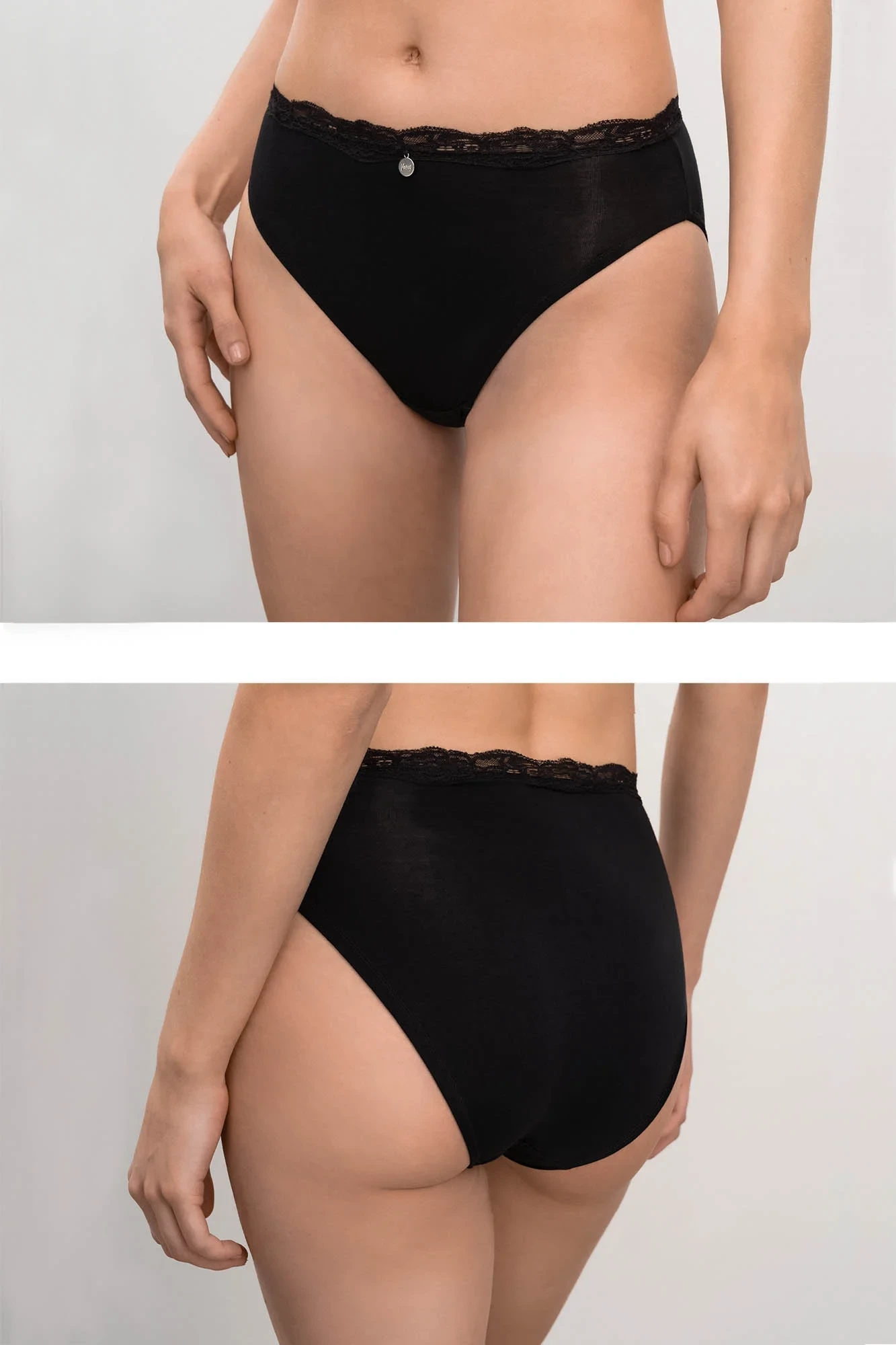 Pohodlné jednobarevné dámské kalhotky s krajkou, které jsou vyrobené z vysoce kvalitního Micro-modalu s příměsí Elastanu. Přírodní Micro-modal poskytuje vyjímečnou měkkost, lehkost a pohodlí, je prodyšný, při praní se nesráží, dobře absorbuje pot a rychle schne, zatímco Elastan dodává oděvu potřebnou pružnost.