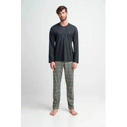 Pohodlné dvoudílné pánské pyžamo pro kvalitní spánek a volný čas. Komplet sestává z trika s dlouhým rukávem a s kulatým výstřihem , který doplňují dlouhé karované kalhoty rovného střihu s pohodlnou gumou v pase. Toto pánské pyžamo je vyrobené z vysoce kvalitní, genetický nemodifikované řecké bavlny, která poskytuje vysoké pohodlí, příjemný pocit na dotek, prodyšnost, pružnost a odolnost. Úplet interlock přispívá k tomu, že se tkanina nekrčí, je odolná, pevná a hřejivá.