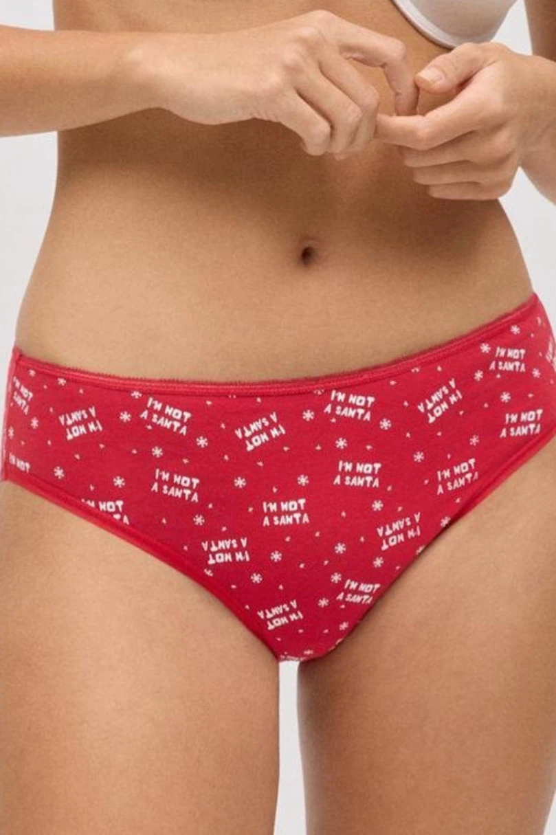 Vánoční kalhotky pro ženy v jasně červené barvě jsou spojením pohodlí a svátečního humoru. Jsou vyrobené z měkké, prodyšné bavlny s elastanem a zaručují dokonalé přizpůsobení a celodenní pohodlí. Model zdobí drobný potisk s nápisem "Nejsem Santa" a motivem sněhové vločky, který jim dodává zvláštní kouzlo. Klasický střih poskytuje pohodlí a volnost pohybu a díky elastickému pasu prádlo dokonale sedí na siluetě. Je skvělou volbou pro zimní dny nebo jako půvabný vánoční dárek.