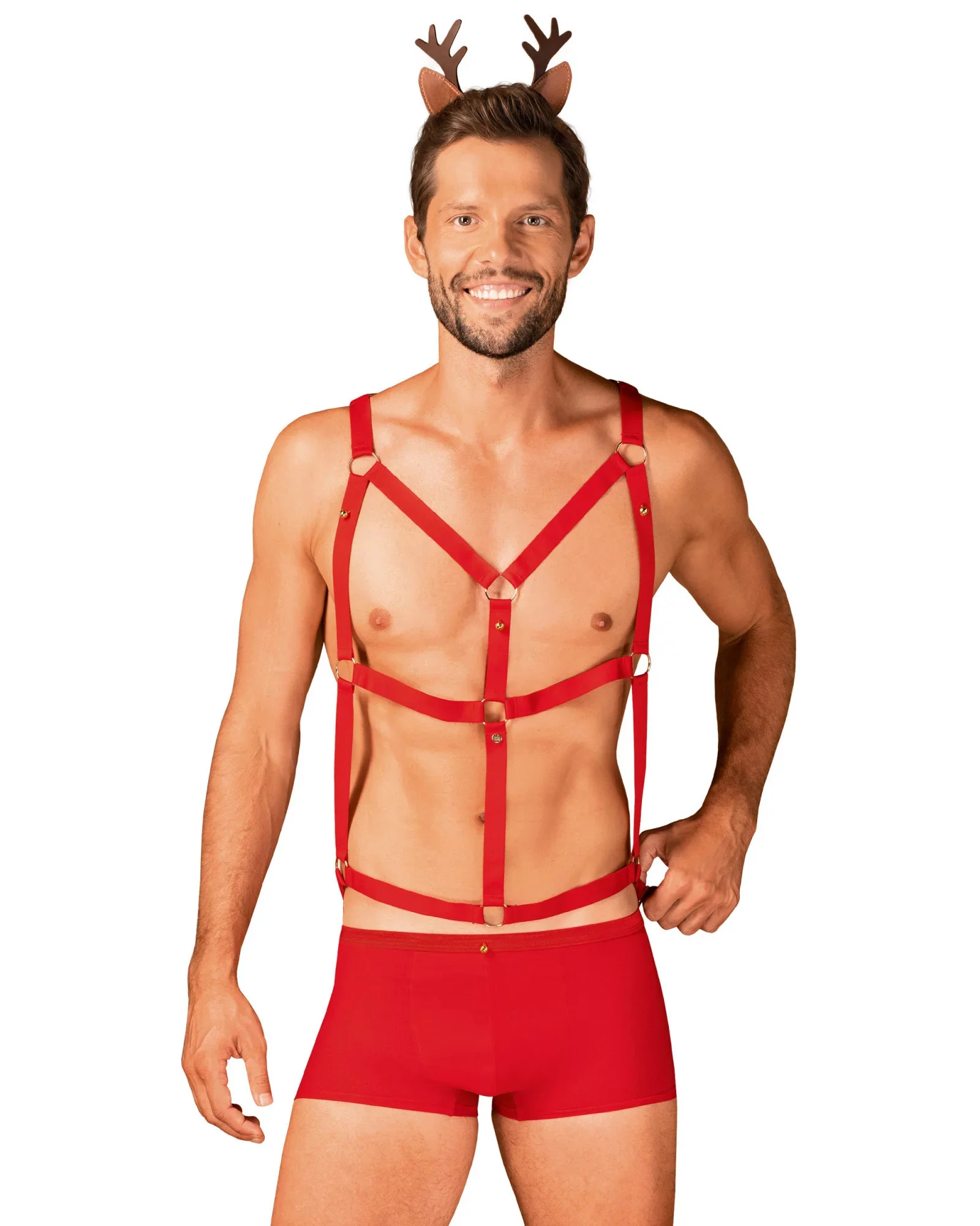 Hravý Mr Reindy má náladu na zábavu! Pikantní červený postroj a svůdné boxerky tvoří velmi sexy a smyslnou dvojici, která je připravena na rošťárny v ložnici. Čelenka se sobími oušky je mimořádně okouzlujícím prvkem, který celek dokonale doplňuje.