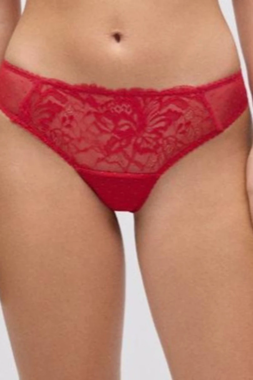 Czerwone stringi koronkowe to idealna propozycja dla kobiet ceniących elegancję i komfort. Wykonane z delikatnej, półprzezroczystej koronki z kwiatowym wzorem, subtelnie podkreślają sylwetkę, dodając zmysłowego charakteru. Elastyczny materiał dopasowuje się do ciała, zapewniając wygodę przez cały dzień. Stringi doskonale sprawdzą się pod dopasowanymi ubraniami – nie odznaczają się na sylwetce i gwarantują pełną swobodę ruchów. Intensywny czerwony kolor i finezyjna koronka sprawiają, że to doskonały wybór zarówno na co dzień, jak i na romantyczne okazje.