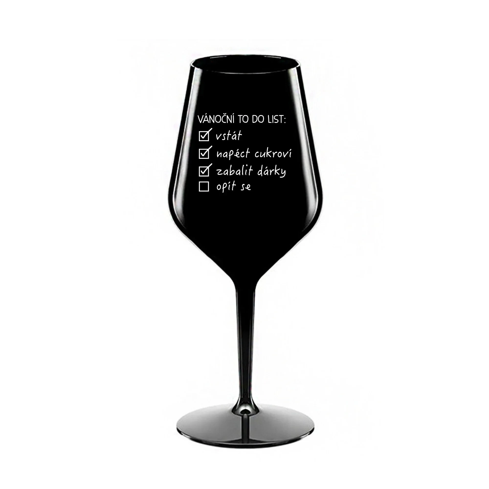 Nerozbitná černá vinná sklenice s motivem VÁNOČNÍ TODO LIST je skvělá na zahradu, pláž, výlet, piknik a parádu udělá i při kempování. Jelikož je vyrobená z kvalitního polykarbonátu je de facto nerozbitná. Je to luxusní kousek, s nímž si víno můžete vychutnat prostě kdekoliv. Mají ergonomický tvar, který příjemně padne do ruky a protože je lehká, usnadňuje to její přenášení. Je snadno skladovatelná a lehce se čistí. Díky svému designu si s ní můžete vychutnat doopravdy kdekoliv bezproblémové pití výborného vína. Materiál PP. Vyrobené s láskou v ČR