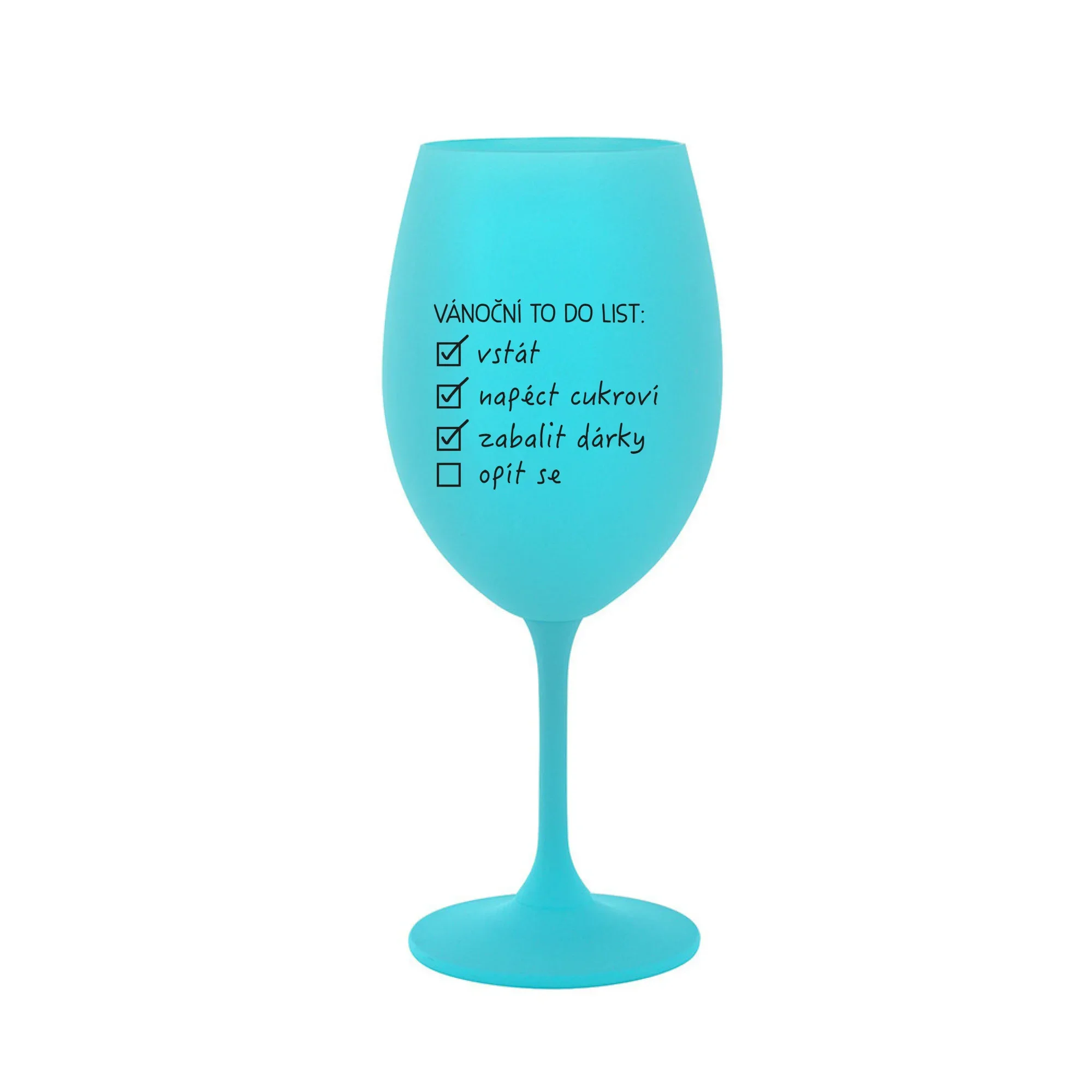 Vinná tyrkysová sklenice s originálním motivem VÁNOČNÍ TODO LIST je krásným a osobitým dárkem, které ale využijete i Vy sami třeba ve chvílích, kdy si budete chtít zpříjemnit náročný den. Tyto originální vinné sklenice jsou totiž nejen pro výjimečné události, ale i pro běžné večery, které si chcete zpříjemnit sklenkou dobrého vína. Jistě proto potěší každého milovníka vína, i toho, kdo si umí svůj život vychutnat plnými doušky. Materiál sklo. Vyrobené s láskou v ČR