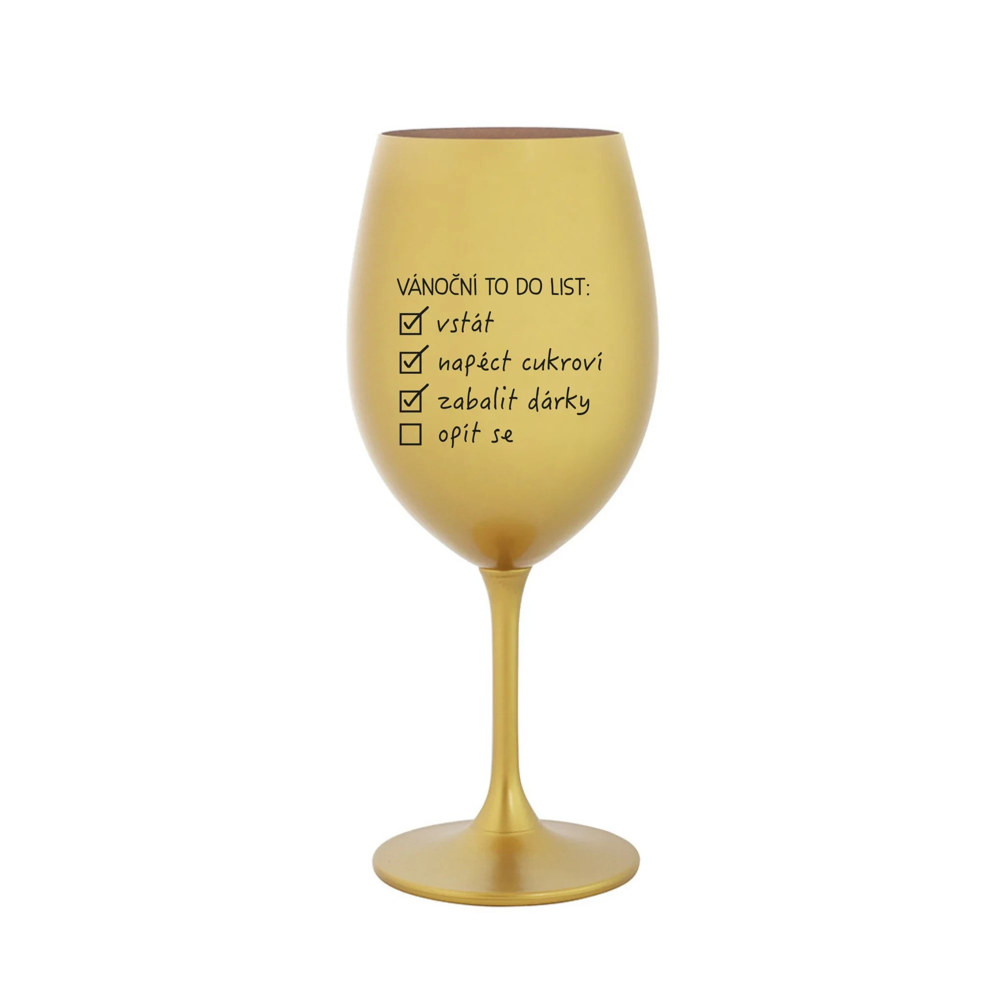 Vinná zlatá sklenice s originálním motivem VÁNOČNÍ TODO LIST je krásným a osobitým dárkem, které ale využijete i Vy sami třeba ve chvílích, kdy si budete chtít zpříjemnit náročný den. Tyto originální vinné sklenice jsou totiž nejen pro výjimečné události, ale i pro běžné večery, které si chcete zpříjemnit sklenkou dobrého vína. Jistě proto potěší každého milovníka vína, i toho, kdo si umí svůj život vychutnat plnými doušky. Materiál sklo. Vyrobené s láskou v ČR