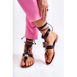 Dámské sandály v žabkovém designu jsou jako stvořené pro letní dny! Model je vyroben z eko kůže. Na středním pruhu jsou ozdobné krystaly. Tyto sandály mají plochý podpatek s protiskluzovou podrážkou. Vázání kolem lýtka znamená, že jej můžete správně přizpůsobit šířce nohy. Extrémně vzdušný model, který by neměl chybět ve vašem šatníku! Při výběru velikosti použijte tabulku velikostí.