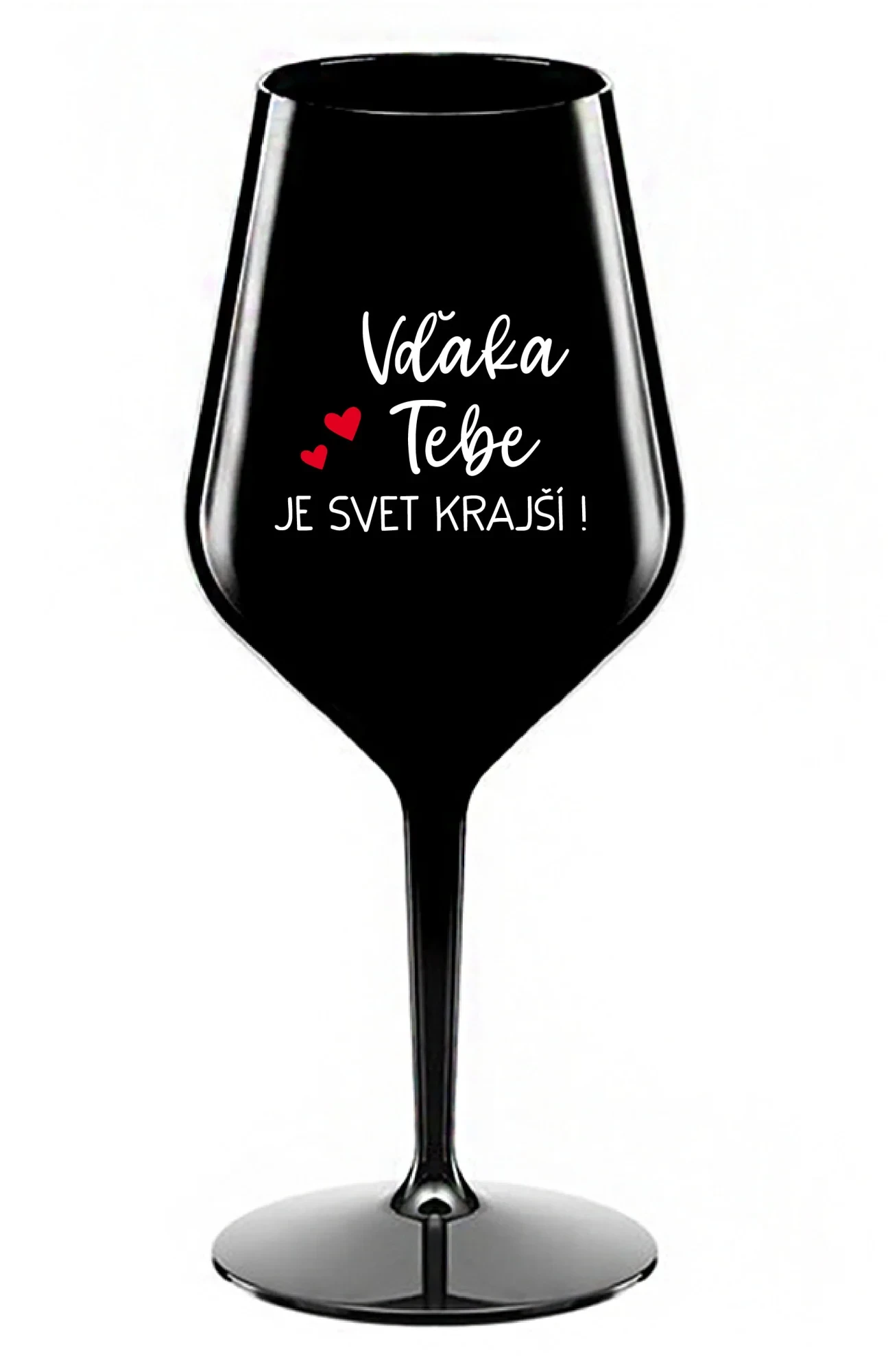 VĎAKA TEBE JE SVET KRAJŠÍ! - čierny nerozbitný pohár na víno 470 ml