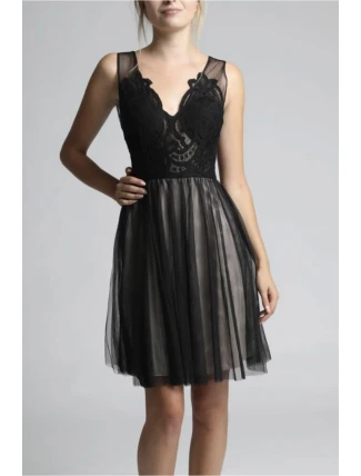 Elegantní šaty s hlubokým výstřihem, zapínané na krytý zip. Šaty jsou vyrobeny z tylu a krajky. Skvěle se hodí pro mnoho příležitostí.