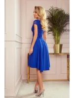 Exkluzivní asymetrické šaty s delšími zády, krátkými rukávy, výstřihem a krajkou v chrpové barvě. Sukně s delším zadním dílem bude ideální pro tanec. Vyrobeno v Polsku. Značka Numoco.