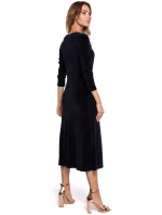 Klasické tužkové šaty bez rukávů odhalují ramena a zvýrazňují křivky, na zádech mají hluboký výstřih zdobený řetízkem. Šaty se zapínají na krytý zip.