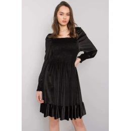 Černé velurové šaty s volánem a dlouhými rukávy. Skvěle se hodí pro mnoho příležitostí. Na zádech jsou všité gumičky, které usnadňují oblékání šatů.