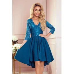 Asymetrické exkluzivní šaty s delšími zády, 3/4 rukávy, výstřihem a krajkou. Šaty v mořské barvě. Sukně s delšími zády bude ideální pro tanec. Vyrobeno v Polsku. Značka Numoco.