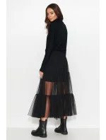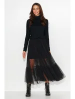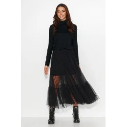 Dlouhé šaty ušité z elastického viskózového úpletu jsou mimořádně pohodlné a elegantní. Šaty mají dlouhé rukávy a praktický rolák, takže jsou ideální pro mnoho příležitostí. Jedná se o maxi šaty se sexy rozparkem, který je navíc zdoben půvabnou zlatou destičkou, což jim dodává jemnou extravaganci. Tato kreace dokonale zvýrazňuje ženskou postavu a zároveň poskytuje pohodlí díky elastickému viskózovému úpletu. K dostání je pouze v černé barvě. Je spolehlivou volbou pro elegantní vycházky. Klasický střih umožňuje šaty použít v mnoha zajímavých stylizacích.