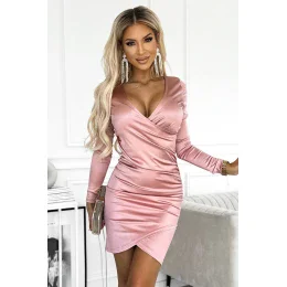 Saténové elegantní šaty s obálkovým výstřihem a dlouhými rukávy. Šaty v barvě špinavě růžové. Vyrobeno ze saténového mírně elastického materiálu (95 % polyester, 5 % elastan). Zapínání na zádech na krytý zip. Značka numoco. Polská výroba.