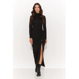 Dlouhé šaty ušité z elastického viskózového úpletu jsou mimořádně pohodlné a elegantní. Šaty mají dlouhé rukávy a praktický rolák, takže jsou ideální pro mnoho příležitostí. Jedná se o maxi šaty se sexy rozparkem, který je navíc zdoben půvabnou zlatou destičkou, což jim dodává jemnou extravaganci. Tato kreace dokonale zvýrazňuje ženskou postavu a zároveň poskytuje pohodlí díky elastickému viskózovému úpletu. K dostání je pouze v černé barvě. Je spolehlivou volbou pro elegantní vycházky. Klasický střih umožňuje šaty použít v mnoha zajímavých stylizacích.