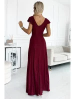 Dlouhé třpytivé maxi šaty s obálkovým výstřihem a rozparkem na nohou. Šaty mají vínovou barvu se třpytkami. Šaty krásně odhalují výstřih a perfektně se hodí k tanci. Zapínají se na zádech na krytý zip. Polský výrobek. Značka numoco.