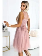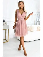 Ženské tylové šaty se srdíčkovým výstřihem a ozdobnou sponou. Zadní díl šatů je ušitý z pružné gumy, takže padnou většině velikostí. Šaty jsou v barvě špinavě růžové. Značka numoco basic. Evropský výrobek.