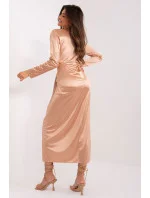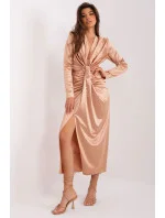 Večerní šaty s hlubokým výstřihem jsou jedinečnou kreací ideální pro elegantní události. Jejich střih je mimořádně jednoduchý, což jim dodává jemný, ale sofistikovaný charakter. Jsou ideální pro slavnostní příležitosti, ženě, která je nosí, dodají eleganci a noblesu. Design šatů se drží minimalistického stylu, kde dominuje hladký, jednolitý povrch. Materiál, ze kterého jsou vyrobeny, je vysoce kvalitní polyester, který zaručuje elegantní vzhled a pohodlné nošení. Šaty mají dlouhé rukávy, díky čemuž jsou vhodné i pro chladnější večery. Midi délka dodává šatům univerzální charakter a zároveň je dostatečně formální pro slavnostnější příležitosti. Díky absenci viditelného zapínání vypadají šaty velmi elegantně a moderně. Dalším ozdobným prvkem jsou jemné záhyby umístěné na přední straně šatů, které jim dodávají jemný, ženský nádech. Tyto večerní šaty s hlubokým výstřihem dokonale podtrhují eleganci a styl své nositelky, takže jsou ideální volbou pro zvláštní příležitosti, kdy záleží na každém detailu.