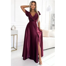 Dlouhé saténové maxi šaty s obálkovým výstřihem a rozparkem na nohou. Šaty jsou ve vínové barvě. Šaty krásně odhalují výstřih a perfektně se hodí k tanci. Zapínají se na zádech na krytý zip. Polský výrobek. Značka numoco.