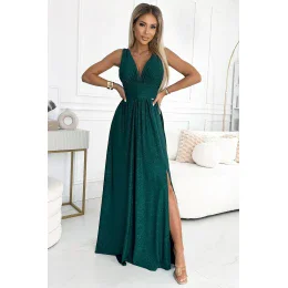 Dlouhé šaty s výstřihem, rozparkem na nohavicích a třemi stehy v pase. Vyrobeno z elastické látky s brokátem v zelené barvě. Ideální na svatby, křtiny a jiné významnější události. Polský výrobek. Značka numoco.
