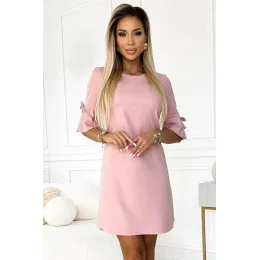 Trapézové pohodlné šaty s rozšířenými rukávy a mašlemi, velmi ženské. Šaty v pudrově růžové barvě se třpytkami. Polský výrobek. Značka numoco.