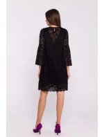 Jedinečné dvouvrstvé šaty s lichoběžníkovým střihem, které kombinují klasickou eleganci s romantickými detaily. Ve spodní části jsou vyrobeny z hladké látky, zatímco vnější vrstvu tvoří jemná krajka, která celému vzhledu dodává jemný a sofistikovaný nádech. Rukávy v délce k loktům jsou zakončeny půvabným volánkem, který vnáší do šatů lehkost a ženský nádech. Šaty v délce ke kolenům poskytují pohodlí a volnost pohybu. Nosí se přes hlavu a mají diskrétní zapínání na zádech pro snadné oblékání. Jsou navrženy a ušity v Polsku a zaujmou kvalitou zpracování a důrazem na detail. Ideální pro zvláštní příležitosti, kdy se chcete cítit stylově a elegantně.