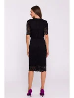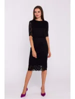Elegantní dvouvrstvé tužkové šaty, které kombinují klasickou hladkou látku ve spodní části s jemnou krajkovou vnější vrstvou a vytvářejí tak elegantní a ženský vzhled. Šaty jsou v pase vykrojené, což zvýrazňuje pas a dodává siluetě proporce. Krátké krajkové rukávy dodávají šatům lehkost a jemný půvab. Délka pod kolena a rozparek na zádech zajišťují pohodlí a volnost pohybu a zároveň zdůrazňují elegantní charakter střihu. Krytý zip na zádech umožňuje diskrétní přizpůsobení postavě. Šaty byly navrženy a ušity v Polsku, což je zárukou nejvyšší kvality zpracování a důrazu na detail. Ideální pro zvláštní příležitosti, kdy chcete vypadat elegantně a na úrovni.